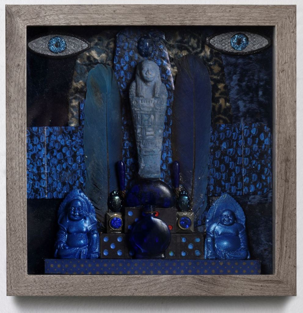 Saar herself, described the work in the following way: “In my studio, I have objects sorted by color (red, blue, brown, etc.), material (wood, metal) or by shape. I started with the central figure, which is a clay or stone sarcophagus I found in a trinket store in Egypt. From this central point I then built out the work. The two Buddhas flanking the sarcophagus I bought in Little Tokyo here in Los Angeles and later painted blue. The two scarabs were given to me by a friend who also likes to collect interesting objects. The centered blue bottle — I think it’s an Evening in Paris perfume bottle. The two all-seeing mystic eyes I made from wood pieces found at a local craft store and then painted. The background is a mixed-media paper collage embedded with feathers. Sometimes, I use game pieces — like dice or dominoes — to represent chance or fate and suggest how we are players in the game of life.”